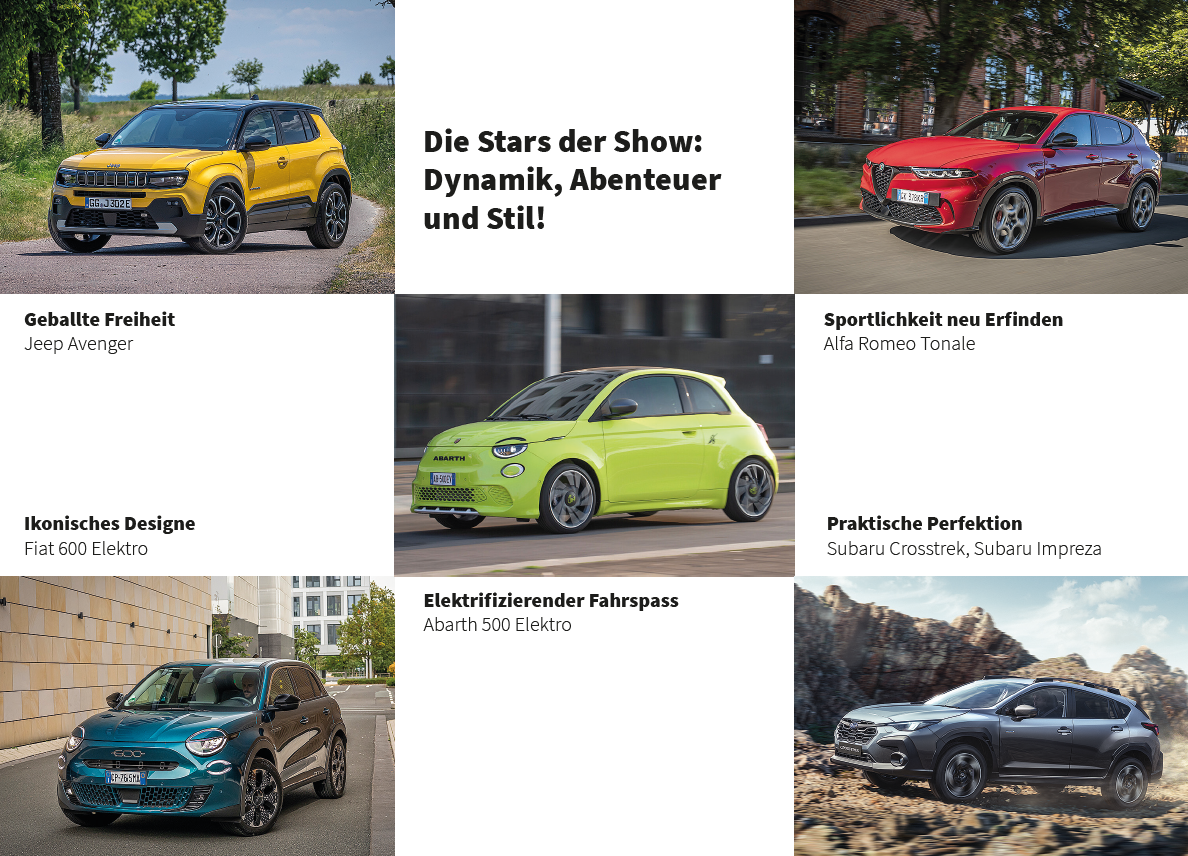 Entdecken Sie unsere Fahrzeugvielfalt und lassen Sie sich beraten. Alle Modelle von Fiat, Fiat Professional, Abarth, Alfa Romeo, Jeep und Subaru stehen für Probefahrten zur Verfügung, damit Sie die Leistung und den Komfort unserer Fahrzeuge selbst erleben können.
